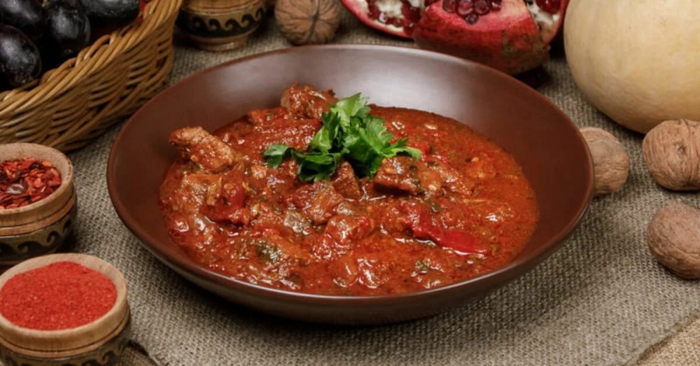 Телятина, томаты, болгарский перец, аджика, зелень, специи.