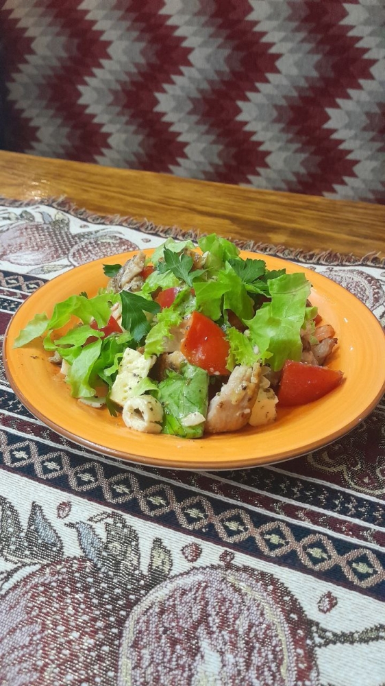 Куриное филе, томаты, болгарский перец, молодой грузинский сыр, фирменная заправка, зелень.
