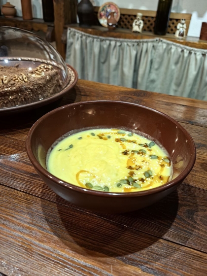 Нежный тыквеннй суп-пюре со сливками, фирменной заправкой, семенами кунжута и тыквы.
