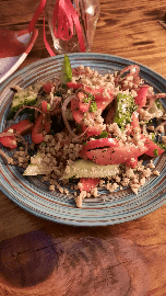 Как принято в Грузии – гостю предлагают все самое лучшее, хачапури, вино и, конечно, мясо. Грузины умеют его готовить. Лучшие кусочки, нежирные сочные в традиционном маринаде и гранатовыми нотками. На столе у хозяйки много зелени, овощей, приправленных ореховой заправкой. Так вкусно, что хочется облизать кончики пальцев и сказать: «Мадлобт», что означает «Спасибо»!